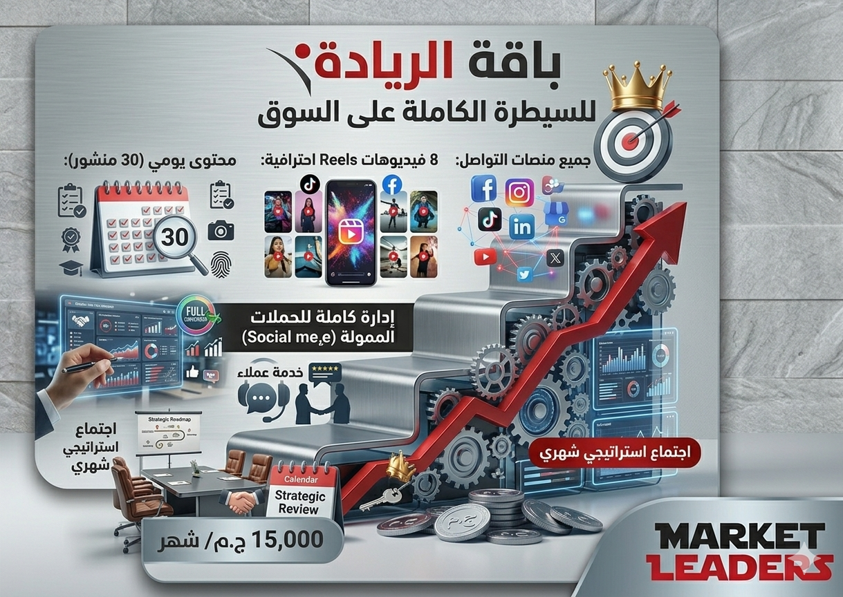 باقة شاملة للسيطرة على السوق وبناء علامة تجارية رائدة. تشمل محتوى يومي (30 منشور)، 8 فيديوهات Reels احترافية، إدارة كاملة للحملات الإعلانية الممولة، خدمة عملاء كاملة، واجتماع شهري لمناقشة الاستراتيجية. تشمل جميع المنصات.